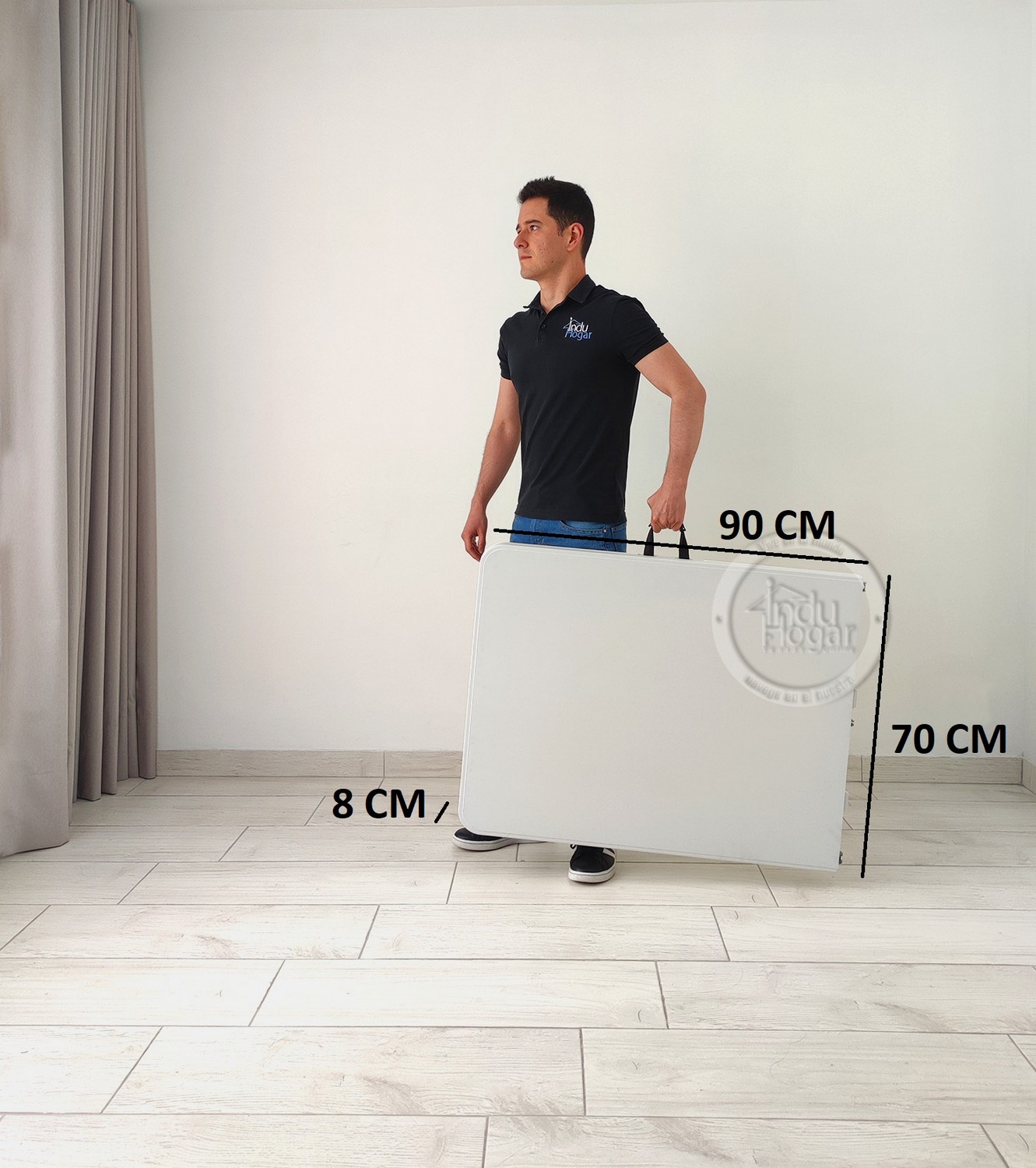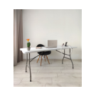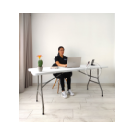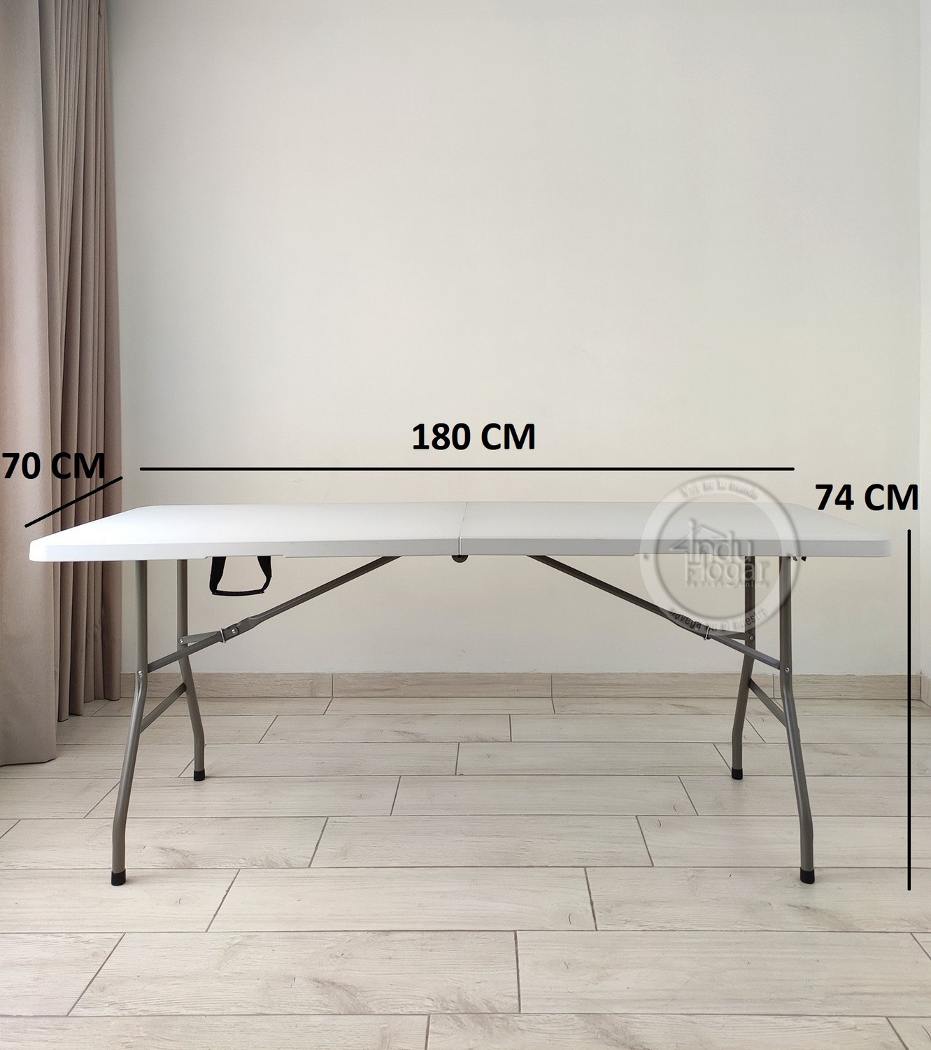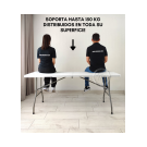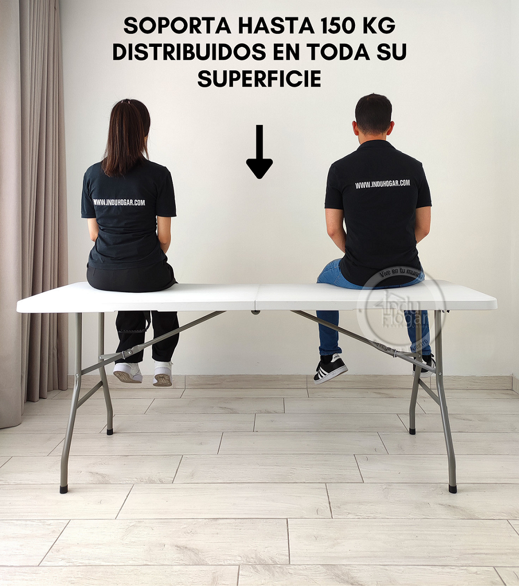 Mesa marca induhogar con estructura en acero que soporta hasta 150kg distribuidos en su superficie. Cuenta con dos tipos de seguro que te dan la tranquilidad de tener una mesa firme y estable; el primer seguro es en acero y se activa automáticamente cuando se abre la mesa y el segundo seguro son dos argollas de acero que se deslizan cuando se voltea la mesa. Es multifuncional ya que la puedes utilizar en banquetes, mesa para el computador, auxiliar para el hogar, eventos recreativos al aire libre etc. También es de fácil almacenamiento y traslado ya que se pliega en forma de maletín y cuenta con manija para cargarla. (SILLAS NO INCLUIDAS)