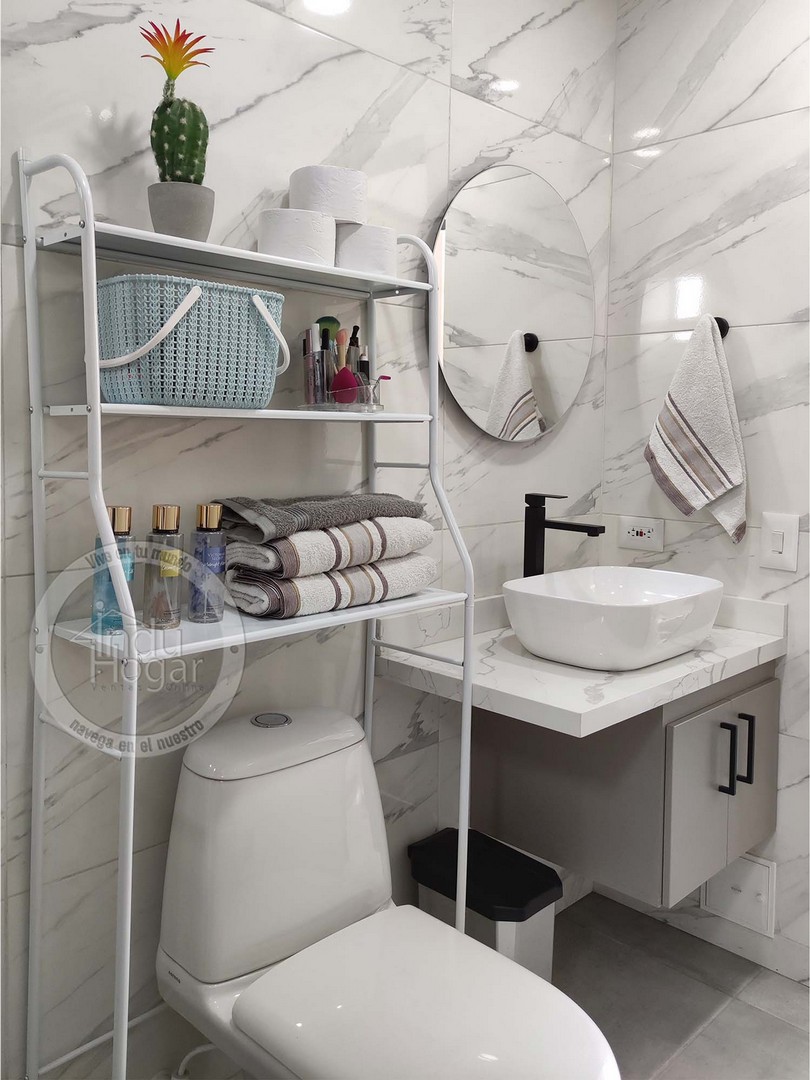 Nuestro producto te permite ahorrar espacio en tu baño manteniéndolo ordenado, a la vez le da un toque estético, minimalista y elegante. Su estructura es totalmente metálica con pintura electroestática, lo que lo hace resistente a la humedad. Cuenta con 3 niveles, accesorios para el papel higiénico y ganchos adicionales como se muestra en las fotografías (fotos reales del producto).
