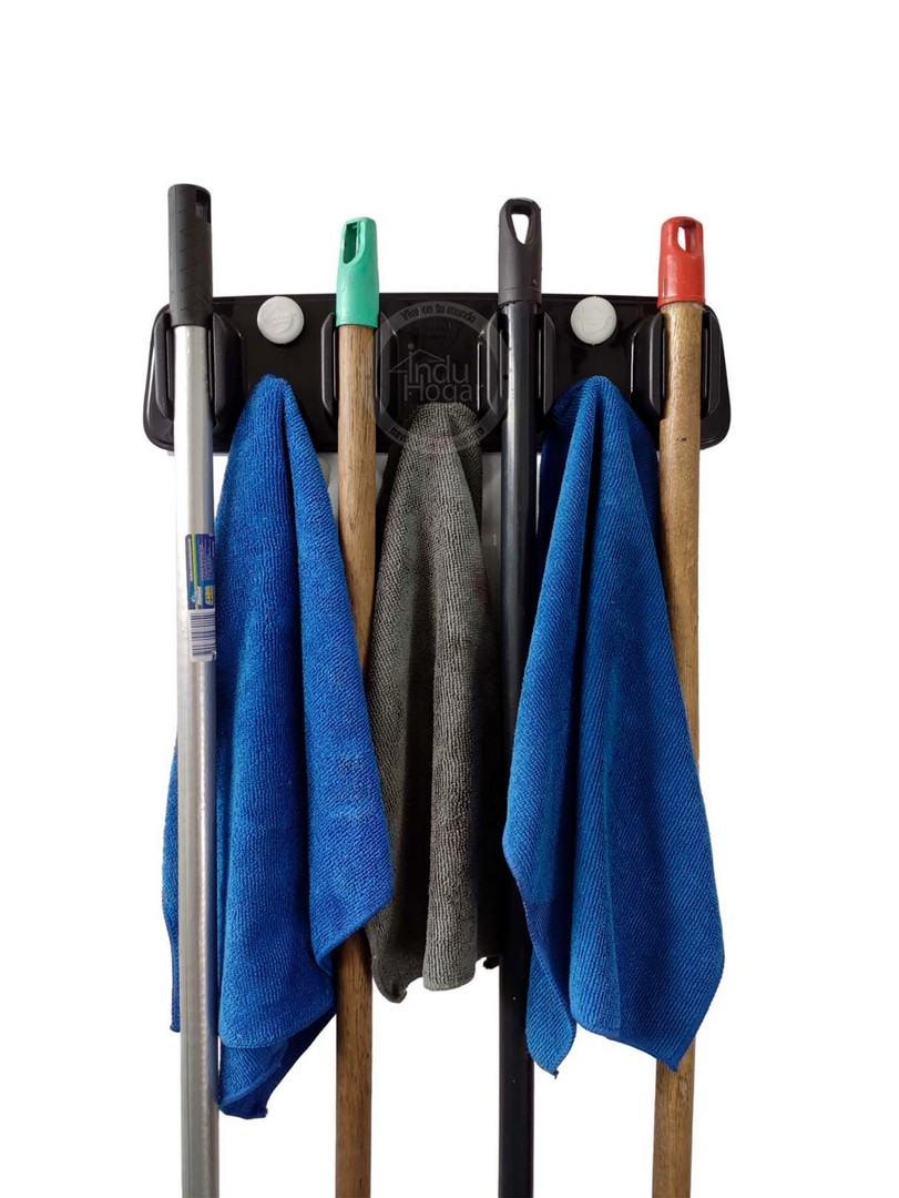 Practico organizador de escoba en plastico ABS de alta densidad que te permite organizar hasta 4 escobas y también cuenta con 3 ganchos auxiliares. Incluye chazos y tornillos para instalarlo en la pared. (tapa tornillos incluido)