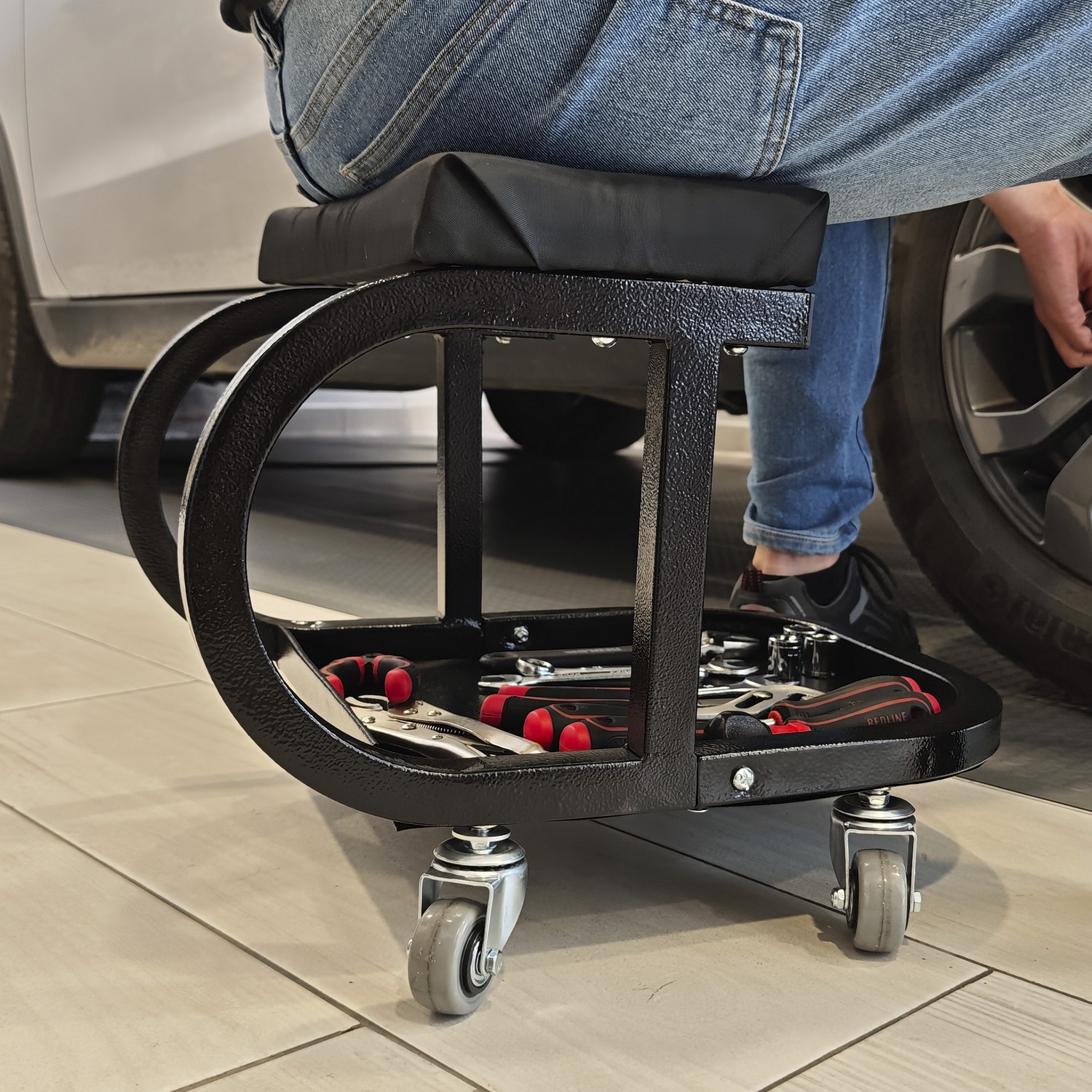 ¿Estás cansado del desorden y de perder tiempo buscando la herramienta? No debes preocuparte más por eso, es hora de transformar tu espacio y optimizar tu tiempo de trabajo con nuestra silla para mecánico, que cambiará tu día a día. Gracias a que cuenta con una robusta bandeja inferior, te ayudará a mantener tus herramientas esenciales organizadas, al alcance de la mano. Olvídate de los bancos estáticos, gracias a sus ruedas con balineras de alta calidad, podrás mover tu estación de trabajo a donde la necesites, sin esfuerzo. Está diseñado para resistir el uso rudo, ya que es totalmente metálico con pintura electroestática y tubo cuadrado calibre 18. El asiento es en espuma rosada de 3 cm de espesor y está tapizado con lona antifluidos.