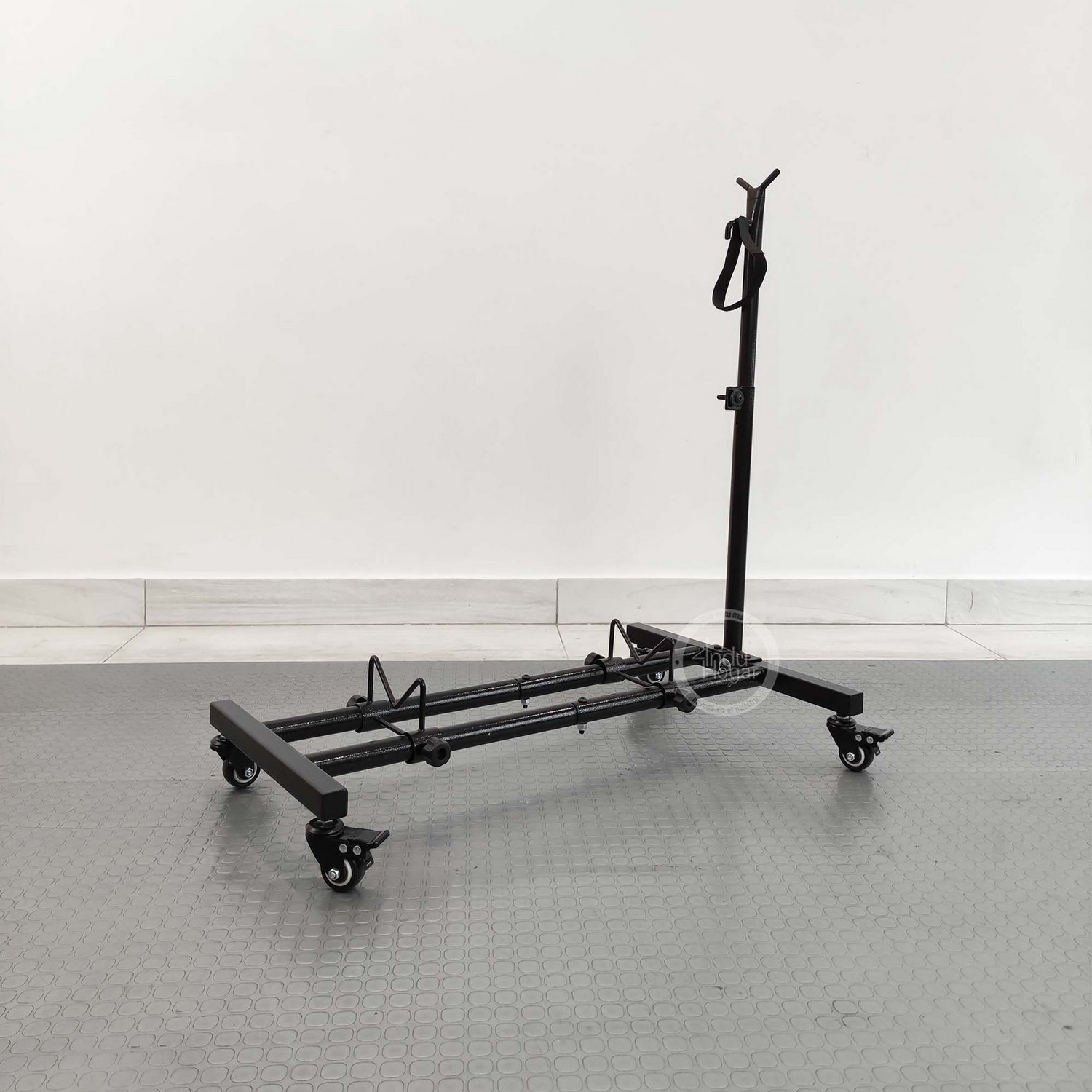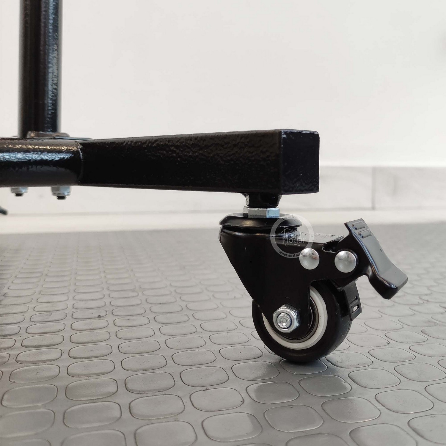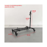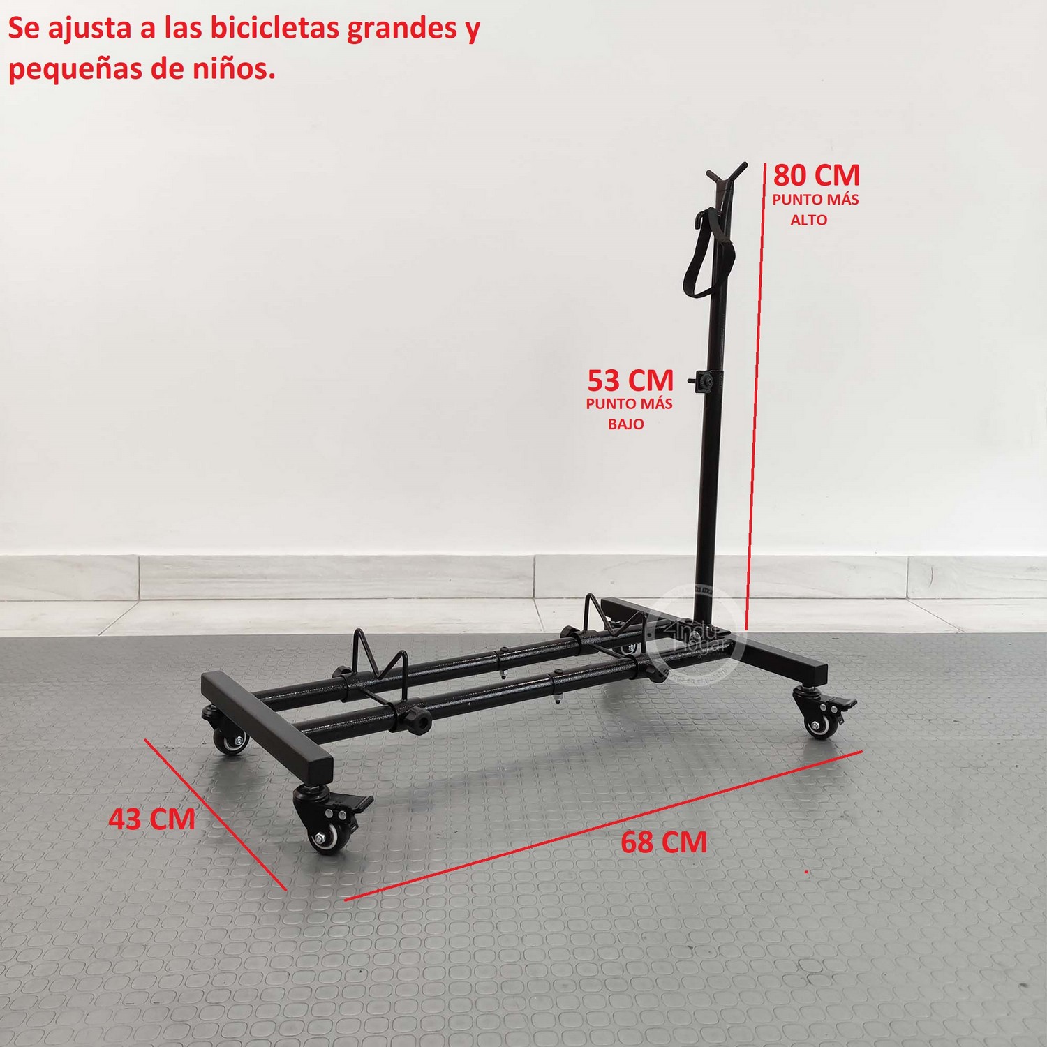 Nuestro soporte es muy seguro, ya que su estructura es totalmente en tubo de acero con pintura electroestática negra, que le dan a tu bicicleta un buen soporte y estabilidad. Tiene ruedas con frenos, lo que facilita su movilidad en espacios reducidos. También incluye dos correas: la grande evita que la llanta delantera y el manubrio se muevan y la pequeña se ajusta al tubo del sillín, para darle mayor estabilidad a la bicicleta.