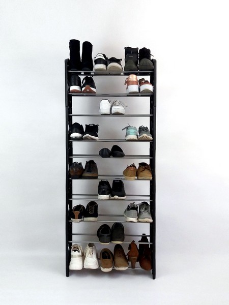 Practica zapatera desarmable de diez entrepaños para 30 pares de zapatos. Diseñada para ser liviana, portable y desarmable.